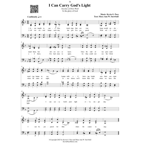 "I Can Carry God’s Light", composed by Kevin G. Pace with text by Mary Ann W. Snowball, is a reverent, sacred hymn that reflects on Jesus’ parable of the ten virgins, taught during Tuesday of Holy Week. Through gentle melody and heartfelt lyrics, the piece emphasizes spiritual readiness and the daily pursuit of divine light. The text draws a clear contrast between those who were prepared and those who were not, offering a personal resolution in the final lines—encouraging each of us to carry God’s light and be ready to receive Christ. It is both a reflection on scripture and a call to faithful living.