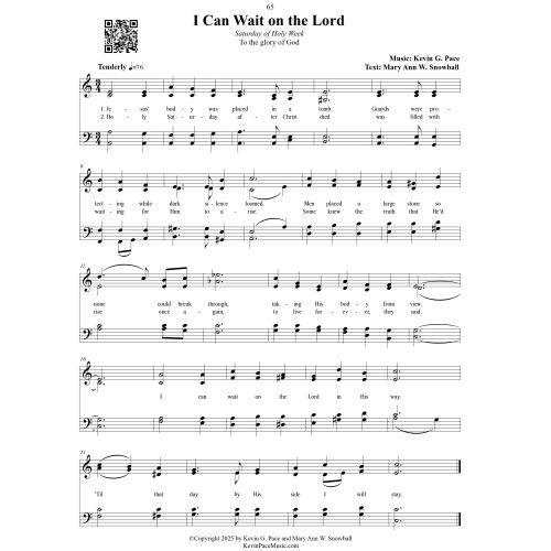 “I Can Wait on the Lord,” with music by Kevin G. Pace and text by Mary Ann W. Snowball, is a gentle and reflective hymn that captures the quiet reverence of Holy Saturday. Set in the stillness between sorrow and triumph, the lyrics recall the solemn waiting after Jesus’ burial, while expressing steadfast faith in His promised resurrection. With tender melody and contemplative tone, the hymn invites worshippers to trust in the Lord’s timing, affirming that even in silence and uncertainty, His presence remains. It is a moving reminder to wait with hope and devotion, anchored in the assurance of eternal life. Purchase the digital sheet music: Listen to more sacred hymns by Kevin G. Pace: Text: I Can Wait on the Lord (Holy Saturday) Jesus’ body was placed in a tomb. Guards were protecting while dark silence loomed. Men placed a large stone so none could break through, taking His body from view. Holy Saturday after Christ died was filled with waiting for Him to arise. Some knew the truth that He’d live once again, to live forever, they said. I can wait on the Lord in His way. ‘Til that day, by His side I will stay.