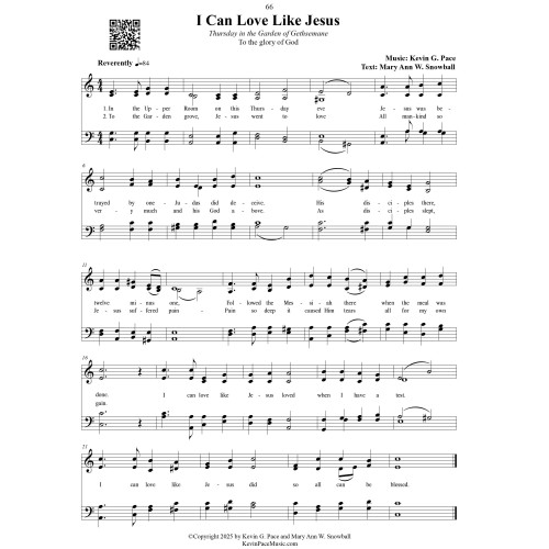 "I Can Love Like Jesus" is a poignant Holy Week hymn capturing the sacred events of Thursday evening in the Garden of Gethsemane. With music by Kevin G. Pace and text by Mary Ann W. Snowball, the hymn reflects on Christ's love amid betrayal, sorrow, and deep personal suffering. From the Last Supper to His anguished prayers while His disciples slept, the Savior’s pure devotion to God and all mankind is reverently portrayed. The text concludes with a heartfelt personal response—an invitation to emulate Christ’s love, especially in times of trial, so that others may also be blessed.