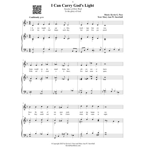 "I Can Carry God’s Light", composed by Kevin G. Pace with text by Mary Ann W. Snowball, is a reverent and instructive children's song that reflects on Jesus’ parable of the ten virgins, taught during Tuesday of Holy Week. Through gentle melody and heartfelt lyrics, the piece emphasizes spiritual readiness and the daily pursuit of divine light. The text draws a clear contrast between those who were prepared and those who were not, offering a personal resolution in the final lines—encouraging each of us to carry God’s light and be ready to receive Christ. It is both a reflection on scripture and a call to faithful living.