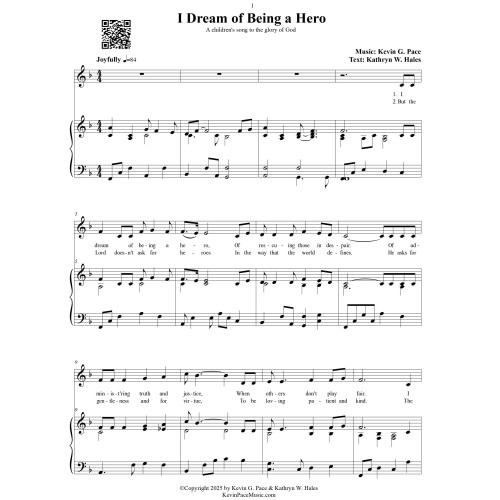 “I Dream of Being a Hero” with music by Kevin G. Pace (ASCAP) and text by Kathryn W. Hales, is a joyful and sacred children’s song that inspires young hearts to see true heroism through the lens of faith. With bright, imaginative language, it begins by capturing a child’s dream of courage and adventure—rescuing others, defending truth, and bringing light to darkness. Yet, the song gently shifts to a deeper message: that God’s heroes are defined not by superpowers, but by gentleness, virtue, and love. Through its uplifting chorus, children are encouraged to be “heroes for Jesus,” drawing strength from His power to live righteously, act bravely, and spread goodness in everyday life. It’s a sweet blend of fun and faith, teaching that real courage comes from following the Savior’s example. Could be sung with unison choir or as a vocal solo.
