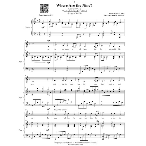 A beautiful, sacred vocal solo. Music composed by Kevin G. Pace with text by Mary Ann W. Snowball. This music is a powerful and sacred reflection on the story from the New Testament where Jesus heals ten lepers, yet only one returns to express gratitude. The music, tender and reverent, flows with an ethereal beauty, perfectly complementing the heartfelt words that speak of faith, healing, and thankfulness. The lyrics poignantly capture the moment of recognition and the depth of gratitude shown by the solitary leper, offering a moving reminder of the importance of returning to give thanks for the blessings we receive. The hymn's gentle melody and profound message invite worshipers into a place of reflection and worship.