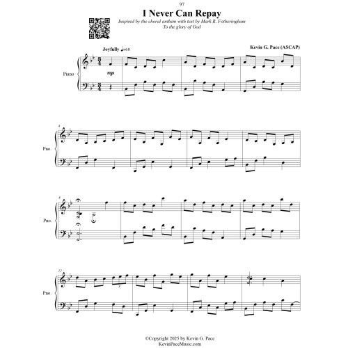 A beautiful piano solo composed for the advanced pianist by Kevin G. Pace. Inspired by the choral anthem with text by Mark R. Fotheringham. Perfect for piano solos, piano recitals, church and religious gatherings, and personal enjoyment.